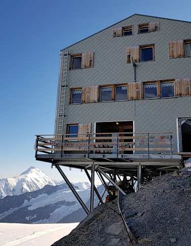 Trotz der hochalpinen Kulisse der über weiten Gletschern gelegenen Britanniahütte (3.030 m) in den Walliser Alpen ist der Zustieg von der Bergstation Felskinn der Bergbahnen Saas Fee leicht und für alle geeignet, die gefahrlos einen Blick ins Hochgebirge werfen wollen.