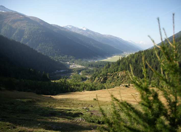 Beim Aufstieg nach Gletsch: Blick zurück Richtung Obergesteln Foto: Stiftung Vier-Quellen-Weg im Gotthardmassiv