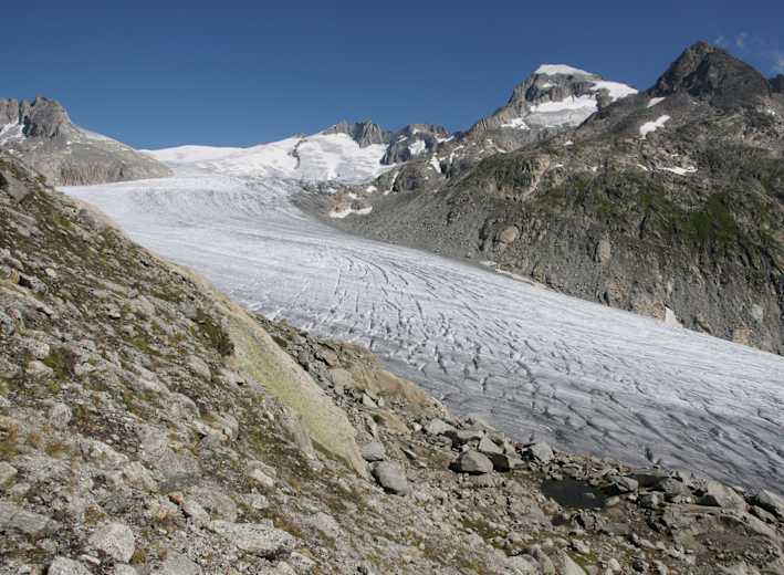 Die Quelle der Rhone kann man aus der Entfernung bestaunen. Von hier ist es nicht mehr Weit bis zum Ziel der heutigen Etappe, dem Hotel Belvédère am Furkapass.