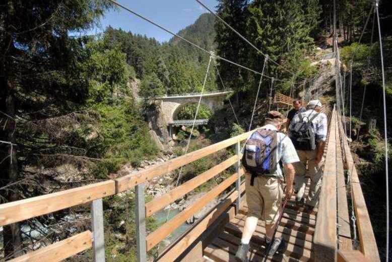 Die Mühen werden jedoch mit tollem Ausblick auf die Glarner Alpen und der spannenden Überquerung einer Hängebrücke belohnt.