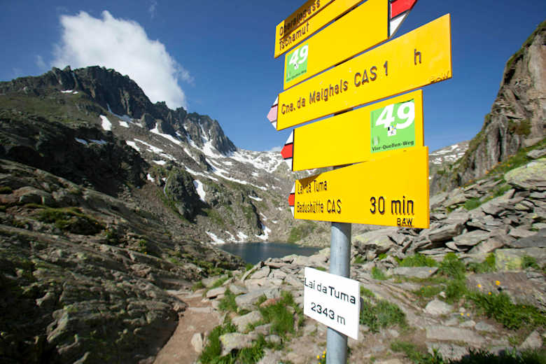 Wo das Wasser als junger Rhein den See verlässt, führt der Wanderweg hinab auf die Fahrstraße zur Camona da Maighels. Diese SAC-Hütte befindet sich etwas oberhalb des idyllischen Lai Urlaun. Sie bildet den Ausgangspunkt für verschiedene schöne Wanderungen und Bergtouren unterschiedlichster Schwierigkeitsgrade.