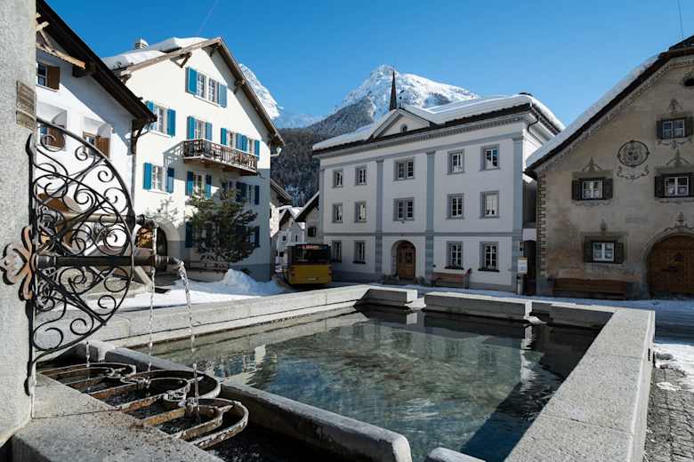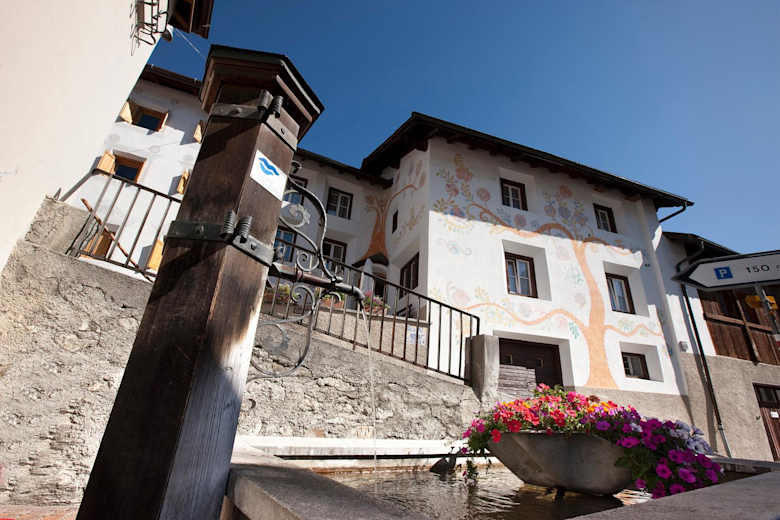 Der Rundgang führt vorbei an schöne Brunnen.Foto: Tourismus Engadin Scuol Samnaun Val Müstair AG, Dominik Täuber