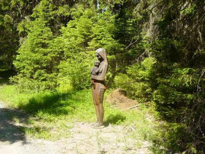 Schöner Spaziergang entlang des Skulpturen-Weges im schweizerischen Graubünden: Ausgehend von Su En entdeckt man am Wegrand über 50 Holz- und Steinfiguren, welche internationale und regionale Künstler beim alljährlichen Bildhauersymposium in Sur En umsetzen.