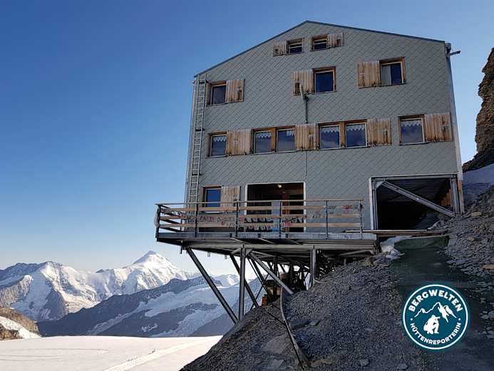 Wenn man die Fahne passiert, die den Zugang über den Ostgrat auf den Mönchsgipfel markiert, ist man in wenigen Minuten bei der Hütte.