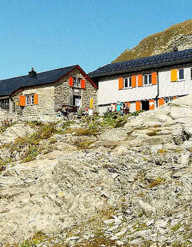 Zur Capanna Adula des CAS folgt man weiter dem breiten Weg nach rechts auf einen Rücken mit einer Kapelle. Hier öffnet sich der Blick auf die wilden Hänge des Val Soi. Von der Anhöhe gelangt man in wenigen Serpentinen hinunter zur Capanna Adula.