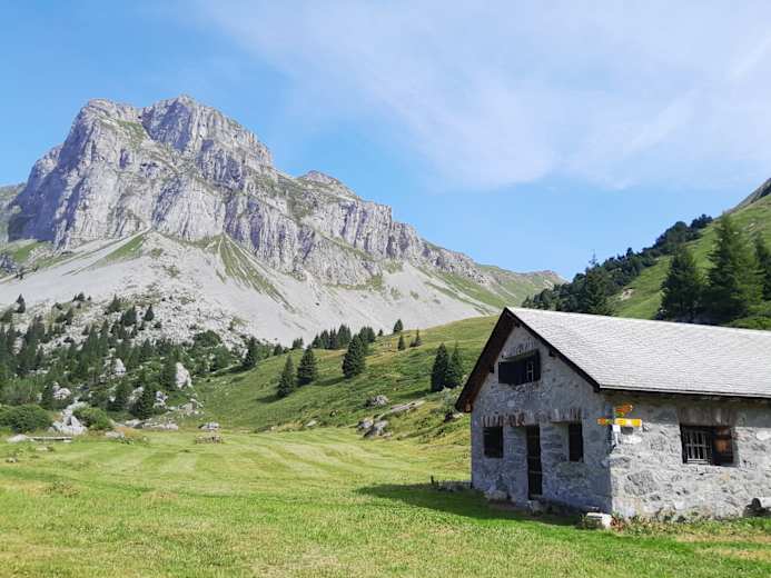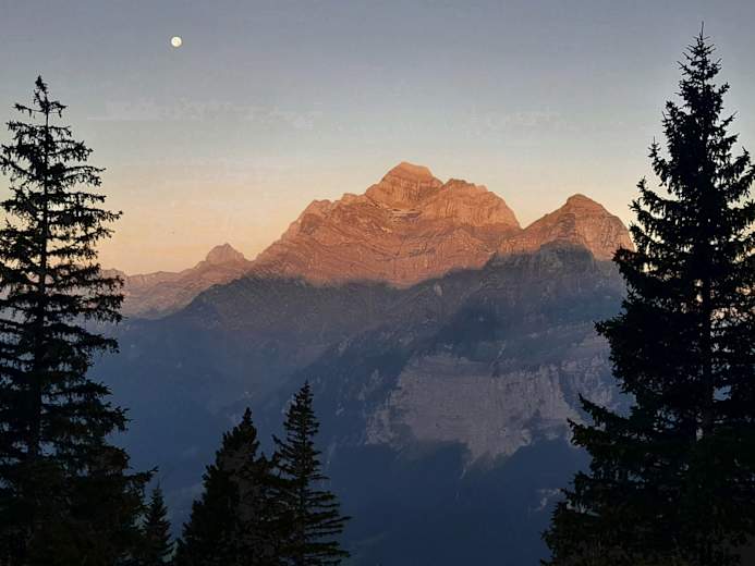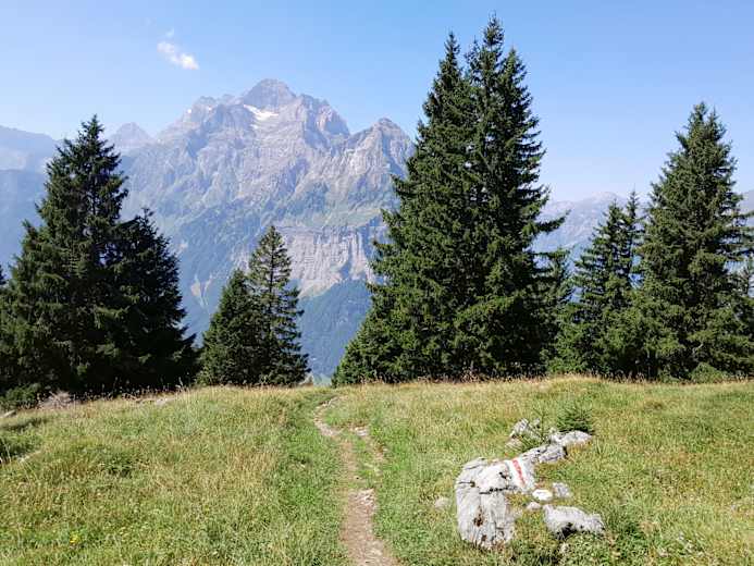 Idyllische Wanderung in den Glarner Alpen: der Holzflue-Rundweg ist eine kurze (rund zwei Stunden) und leichte Rundwanderung in der nördlichen Umgebung der Aeugstenhütte (1.495m, erreichbar mit Seilbahn ab Ennenda) bis hinauf zur Waldgrenze bei der Alp Begligen. Dabei bieten sich sehr schöne Aussichten nach Süden (Linthal), nach Westen (zum Glärnisch, 2.911 m) und nach Norden (zum Schilt, 2.299 m). Diese Rundtour kann natürlich in beiden Richtungen begangen werden, ist gut markiert (durchgehend weiss-rot-weiss) und leicht, eignet sich daher also auch als Spaziergang am ganz frühen Morgen, falls man auf der Hütte übernachtet hat.