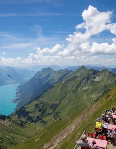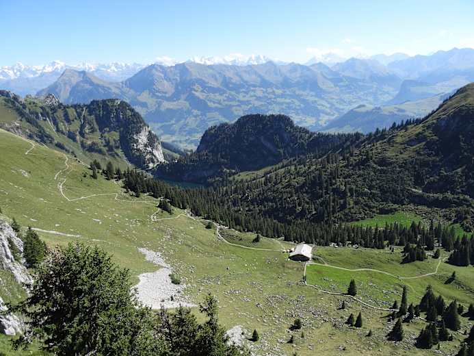 Um den Ausläufer herum gelangt man, auf kurzem, leicht steinigen Weg, zur gut sichtbaren Bergstation der Luftseilbahn und von dort nach wenigen Metern zum Gipfel des Stockhorns auf 1.920 m. Hier eröffnet sich eine fantastische Rundsicht vom Jura über den Thunersee bis zu den hohen Bernern Alpen mit Eiger, Mönch und Jungfrau.