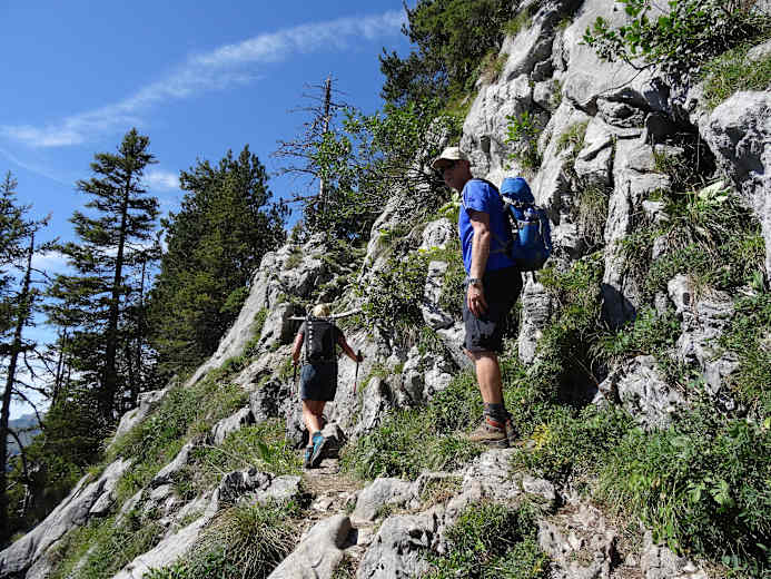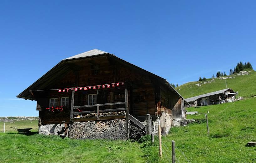 Nach der ersten grösseren Steigung bietet sich eine kurze Rast an. Dann geht es weiter, meist über offenes Alpgelände aufsteigend bis man die Häuschen auf Husallmi erreicht. Wenig später gelangt man, das Strässchen stets auf dem Wanderweg abkürzend, das grosszügige, weitläufige Almgelände auf Vorderstocke.