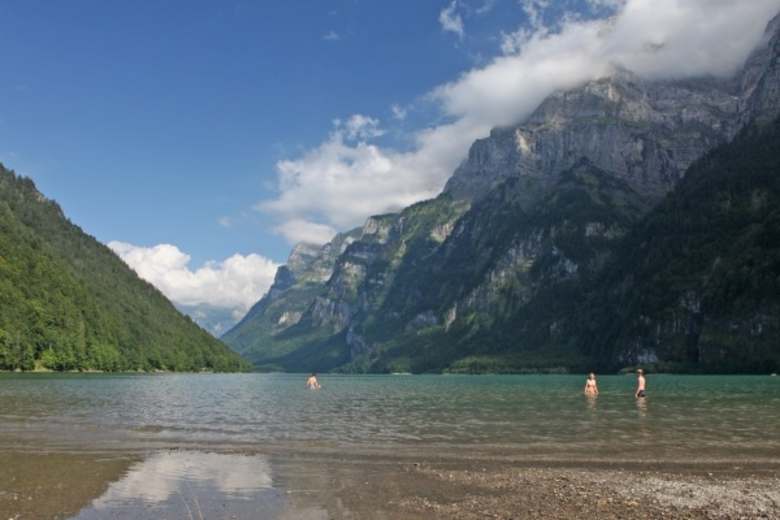 Das Wasser des Klöntalersees ist überraschend warm (ca 19° C) und lädt zum Plantschen ein.