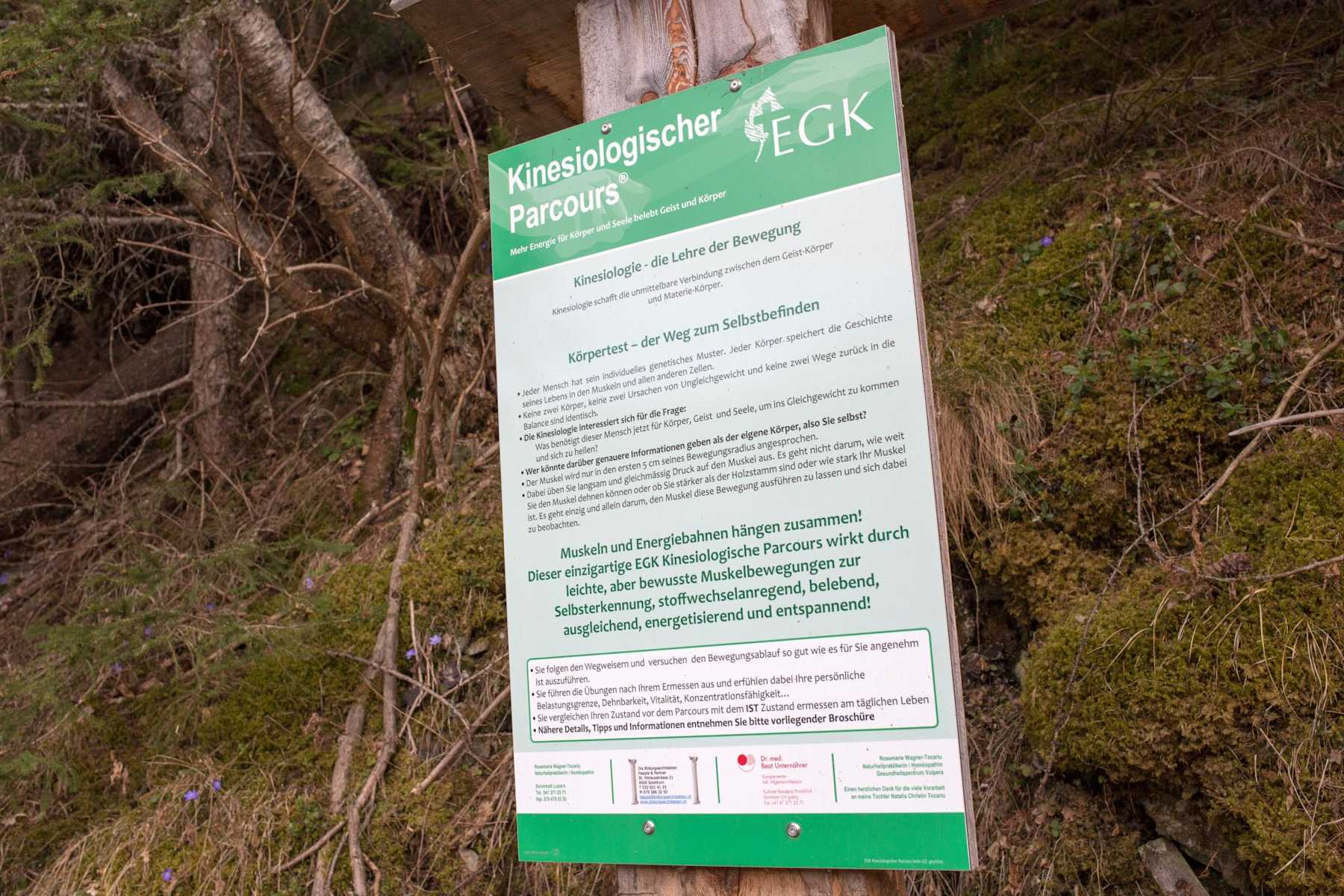 Frei nach dem Motto "Wandern ist gut für Körper und Geist" folgt man dem EGK Kinesiologischen Parcours im schweizerischen Graubünden einem sportlichen Wissen- und Lehrpfad. Ausgehend von Vulpera (1.318 m) umfasst diese rund 2 km lange Runde 14 Übungsposten.