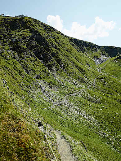 Die ausgesetzten Stellen sind mit Seilen gesichert. Wer ein Fernglas mitnimmt, kann die Kletterer in der Wand beobachten. Zum Schluss der Tour geht es im forschen Zickzack hinunter zur Bahnstation Alpiglen.