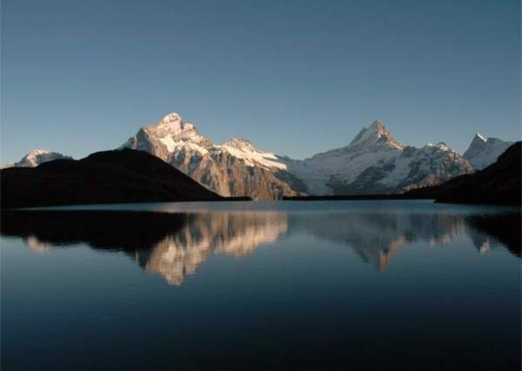 Das beliebte Wandergebiet First in der Jungfrau-Region im Berner Oberland bietet zahlreiche Routen und Touren für alle Altersgruppen. Auf dieser ausdauernden Wanderung prägen weidende Kühe und die sich im See spiegelnden, schneebedeckten Berggiganten der Berner Alpen das Landschaftsbild.