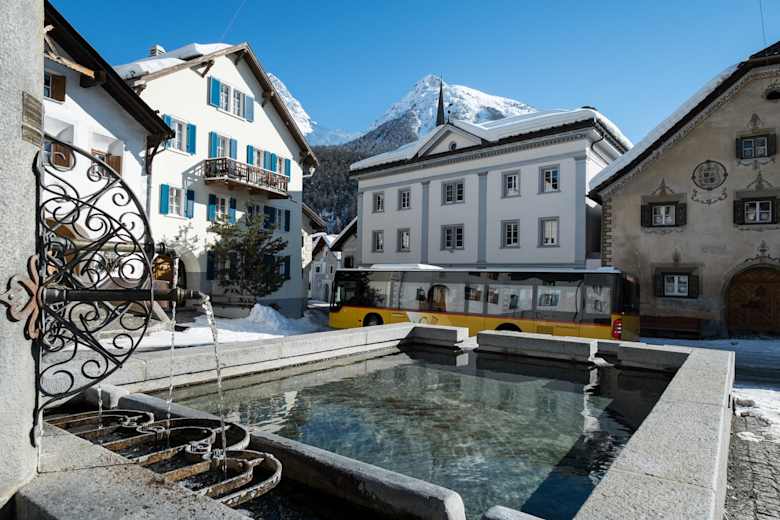 Mit dem PostAuto ab Martina, Sent, Ftan oder Tarasp stündlich bis zur Haltestelle Scuol, posta