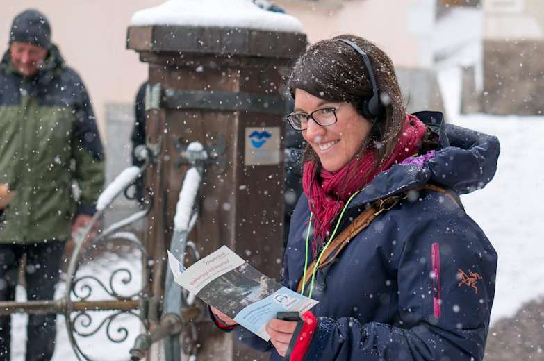 Die Tour mit dem klingenden Namen "myclimate Audio Adventure Scuol" ist ein interaktives Hörerlebnis. Man hat einen ganz persönlichen Guide im Ohr, welcher einem, mit der angenehmen Stimme der Schauspielerin Tonia Maria Zindel, drei Geschichten zu den Themen Wasser, Dorfgeschichte und Klima erzählt.