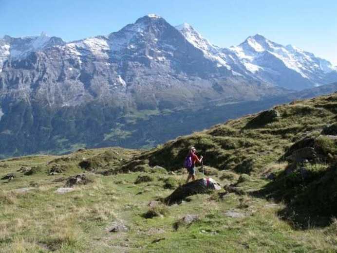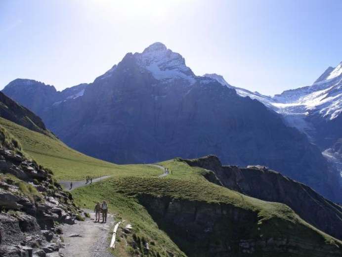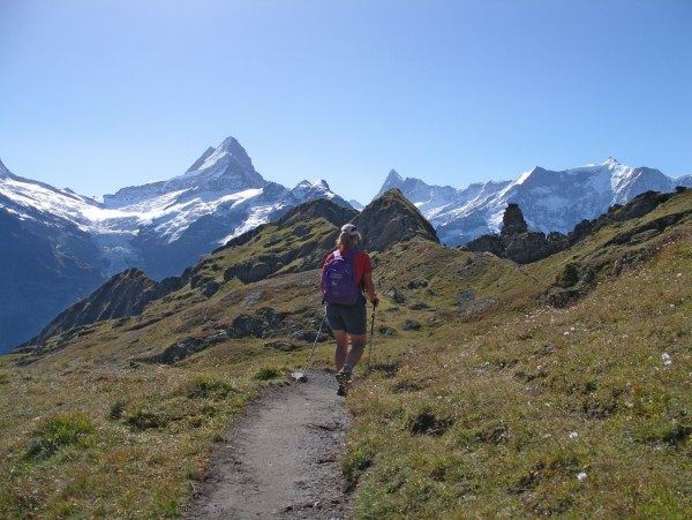 Wanderweg mit grandioser Panoramasicht ins Grindelwaldtal und auf die Eis bedeckten Berner Alpen.