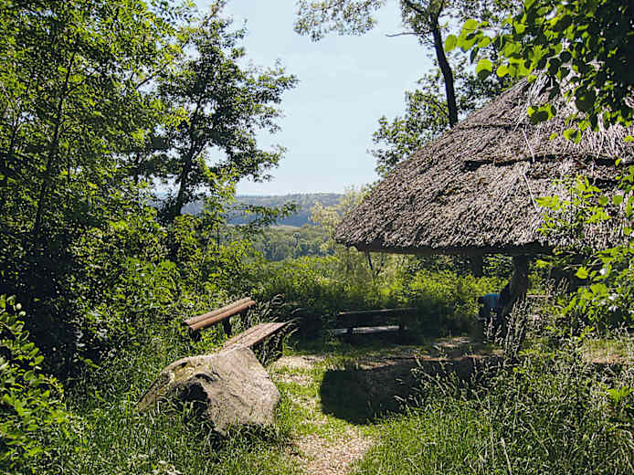 Von einer Schutzhütte aus hat man einen schönen Blick auf den unten liegenden Großen Klobichsee. Hier biegt man rechts ab und folgt ein Stück dem jetzt mit gelbem Punkt markierten Rundwanderweg um den See. Wo die Markierung links abzweigt, geht man geradeaus weiter und erreicht nach 300 m wieder die Alte Berliner Straße. Auf ihr läuft man rechts zur 200 m entfernten Frühstückseiche.