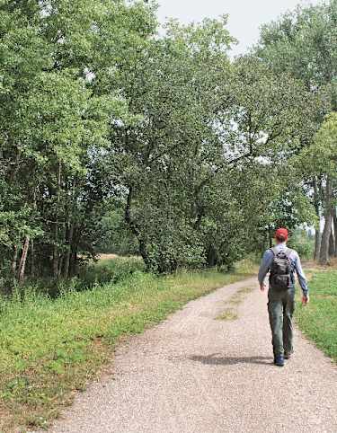 Nach 10 Minuten kommt man am ehemaligen Waldbad vorbei, dessen mit Schilf bestandenes Schwimmbecken man rechts unterhalb des Weges sehen kann. Unmittelbar danach überquert man Gleise einer stillgelegten Eisenbahnlinie. Dann geht es am Rand eines Bruchwaldes und später einer großen Hecke entlang weiter nach Süden. An einer Schotterstraße hält man sich mit der Markierung rechts.