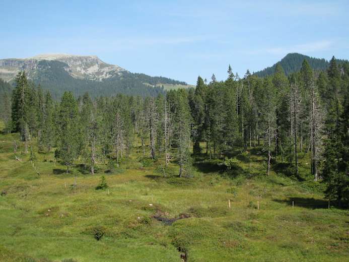 Beim Rastplatz am von Wald begrenzten Grüenenbergpass verlässt man den gelb markierten Weg und folgt nun den weiß-rot-weißen Bergwegmarkierungen, die spielerisch durch sumpfige Vertiefungen und um schartige Felsbänder herumführen.