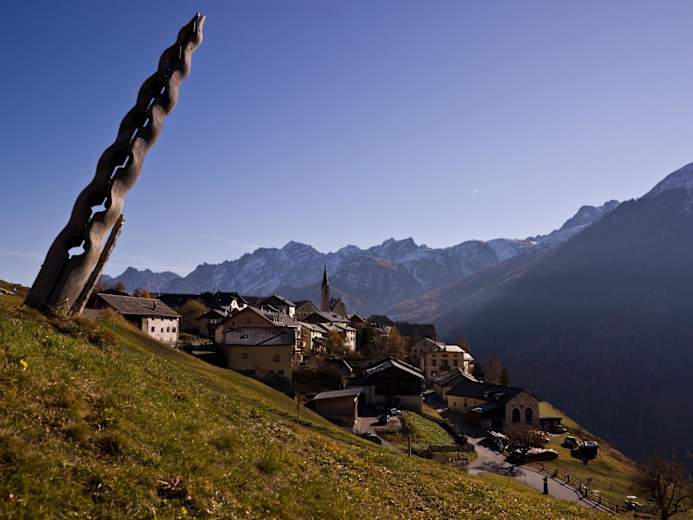 Schöne Pilgeretappe in der Bergwelt der Silvretta Gruppe im Kanton Graubünden in der Schweiz: Etappe 4 des Jakobswegs Graubünden führt ausgehend von Scuol über Ftan und Ardez in das Schellen-Ursli-Dorf Guarda.