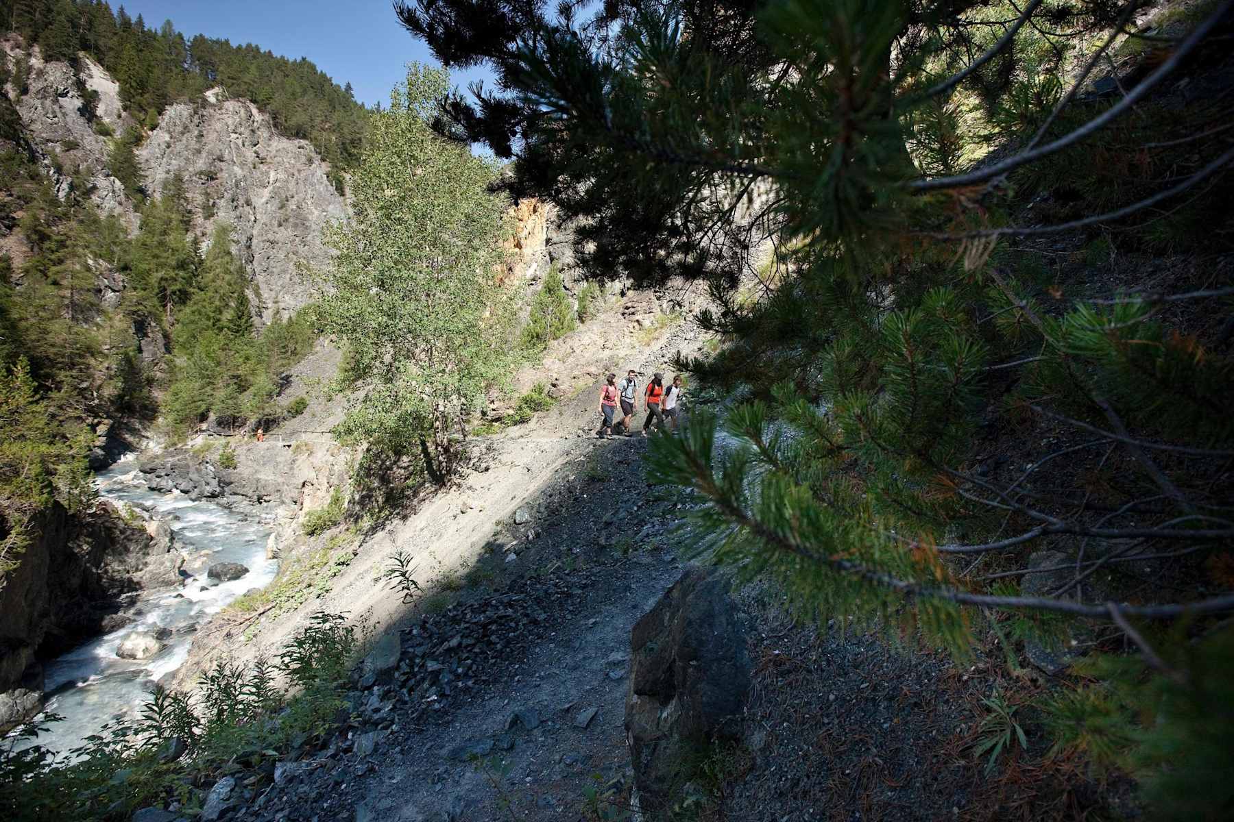 Etappe 3 des Jakobswegs Graubünden in der Schweiz führt ausgehend vom idyllischen Alpendorf S-charl, vorbei an der Schmelzra mit den Mauerresten der alten Schmelzöfen, ins schöne Val Minger. Der Beschilderung der Route 43 folgend, pilgert man durch das schöne Tal und weiter entlang der Clemgia und durchschreitet die Clemgiaschlucht.