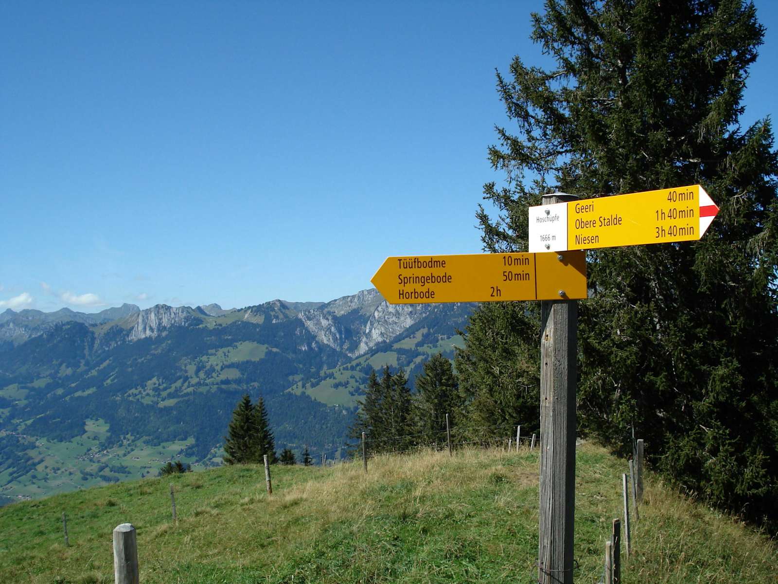 - Der Wanderweg zweigt hier nach Hohschüpfen ab. - Foto: Interlaken Tourismus  - Der Ausblick vom Hohschüpfen ins Diemtigtal. - Foto: Interlaken Tourismus - Vom Niesen bietet sich ein wunderschöner Weitblick. - Foto: Interlaken Tourismus - Die Panoramawanderung führt ins Diemtigtal. - Foto: Interlaken Tourismus - Bildergalerie (4)
