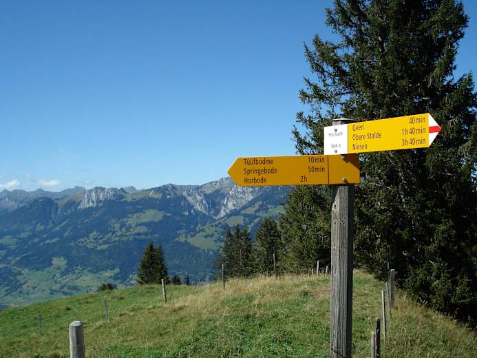 Der dreieckige Niesen ist immer ein Besuch wert. Die Bergstation (2.345 m) ist der Start und der höchste Punkt der Panoramawanderung zugleich. Über ausgeschilderte Bergwanderwege senkt sich die Route im Zickzack zur oberen Stalde (1.705 m) und macht eine scharfe Kurve.
