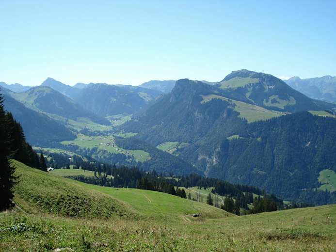 Quer durch Vieh- und Schafsherden führt der Panoramaweg weiter talwärts ins Diemtigtal nach Gsässweid (1.346 m).