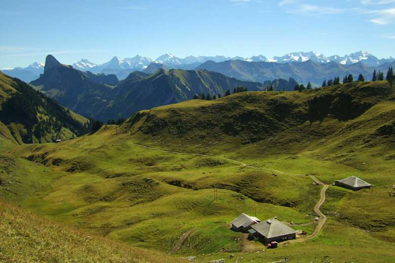 Vom Wetterhorn bis zum Wildhorn ist die Hochalpenkette über die Grate und Buckel des Simmen- und des Diemtigtals erkennbar. Etwas weniger abwechslungsreich ist es auf dem Pfad in der Flanke der Chrummfaden- und der Nünenenflue zwischen Schiterwang und Leiterepass (über den Morgetepass zur Unteren Gantrischhütte 1:40 h). Die auf der Passhöhe befindliche Tafel erinnert an die jungen internationalen Helfer, die 1972/73 diesen Höhenweg erbaut haben.