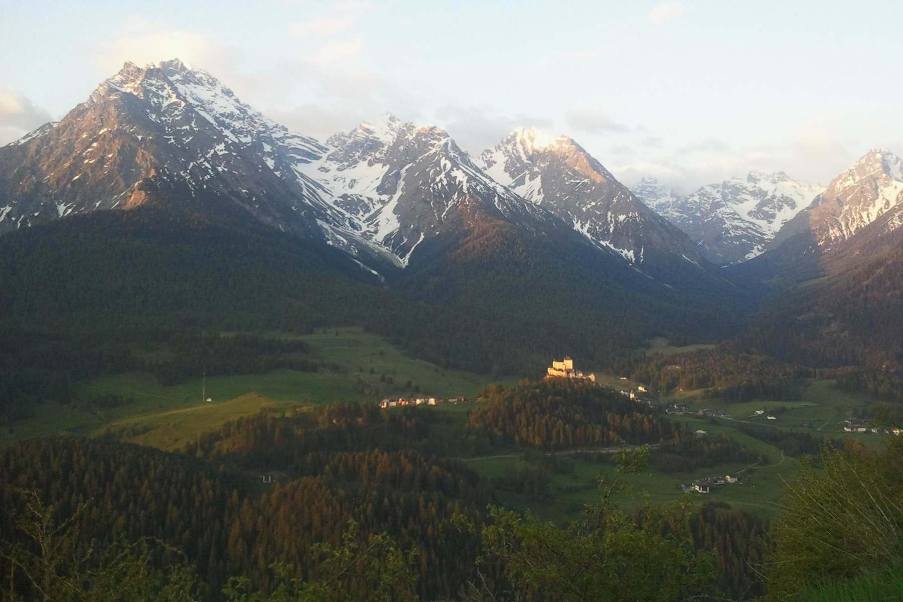 Panoramablick auf das Unterengadin mit Schloss Tarasp. Foto: Michael Leibacher, Tourismus Engadin Scuol Samnaun Val Müstair AG