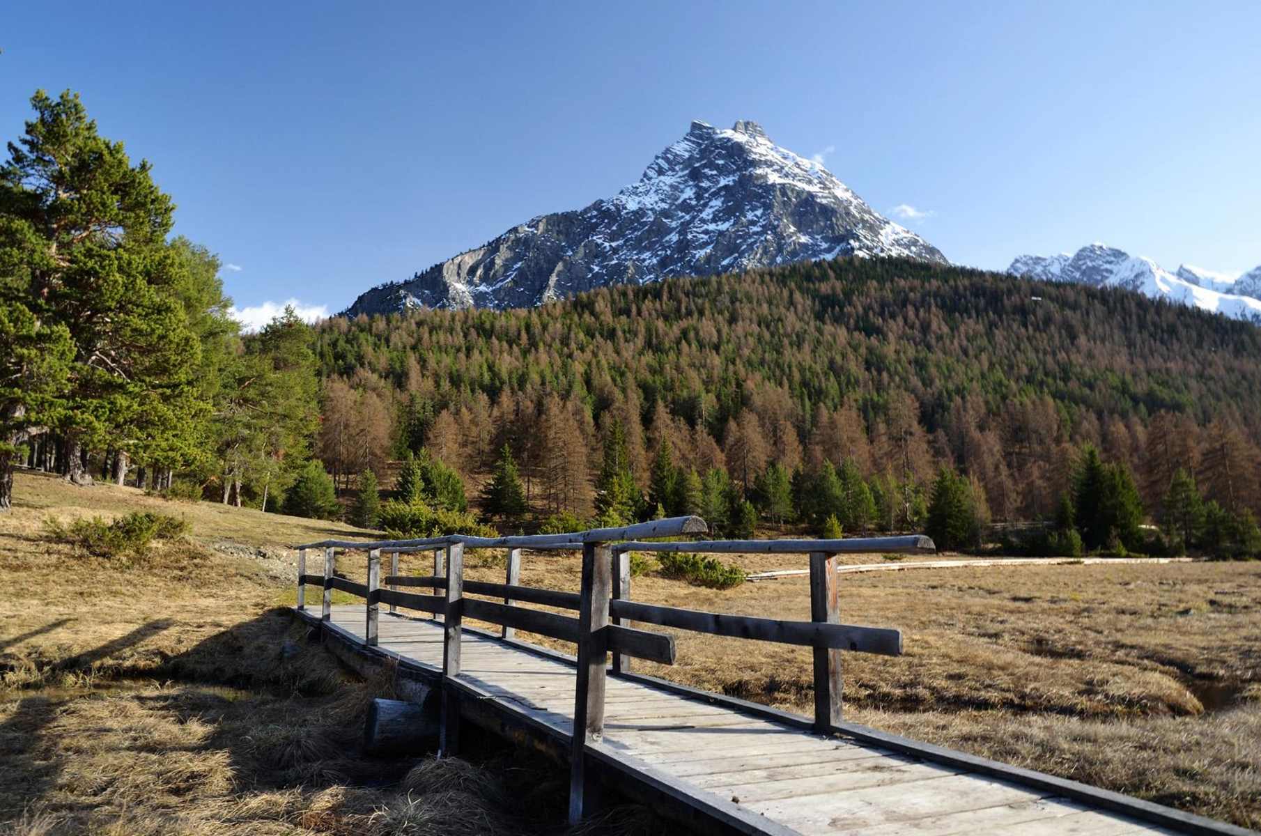 Den Weiler passierend steigt man durch den Wald zum Bergsee Lai Nair auf. Über das Hochmoor hinweg geht es weiter bergab nach Tarasp Fontana. Man lässt den See links liegen und wandert nach Vulpera und schlussendlich weiter nach Gurlaina.