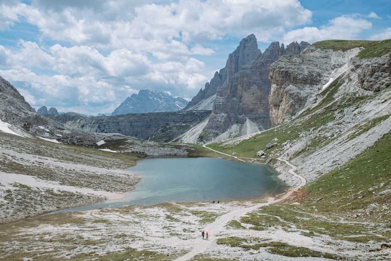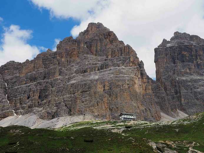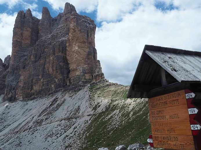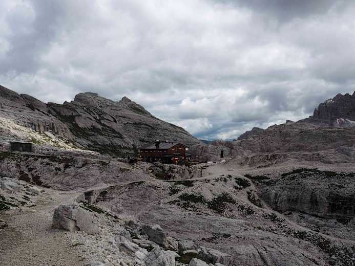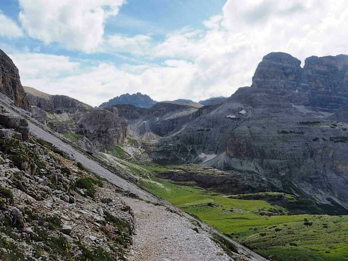 Von der Lavaredohütte auf 2.433 m weiter, führt der Karrenweg Nr. 104 zunächst vorbei an zwei kleinen Seen, dann ca. 200 Höhenmeter bergab. Kurz nach dem tiefsten Punkt zweigt links der Klettersteig, eine kürzere, aber schwierigere Variante des Zustiegs, ab. An dieser Wegkreuzung hält man sich aber weiter geradeaus, ebenso wie beim nächsten Abzweig der nach rechts ins Val di Cengia führt. Der nun steil ansteigende Weg führt noch einmal auf einem kleinen Plateau an zwei kleinen Seen vorbei.