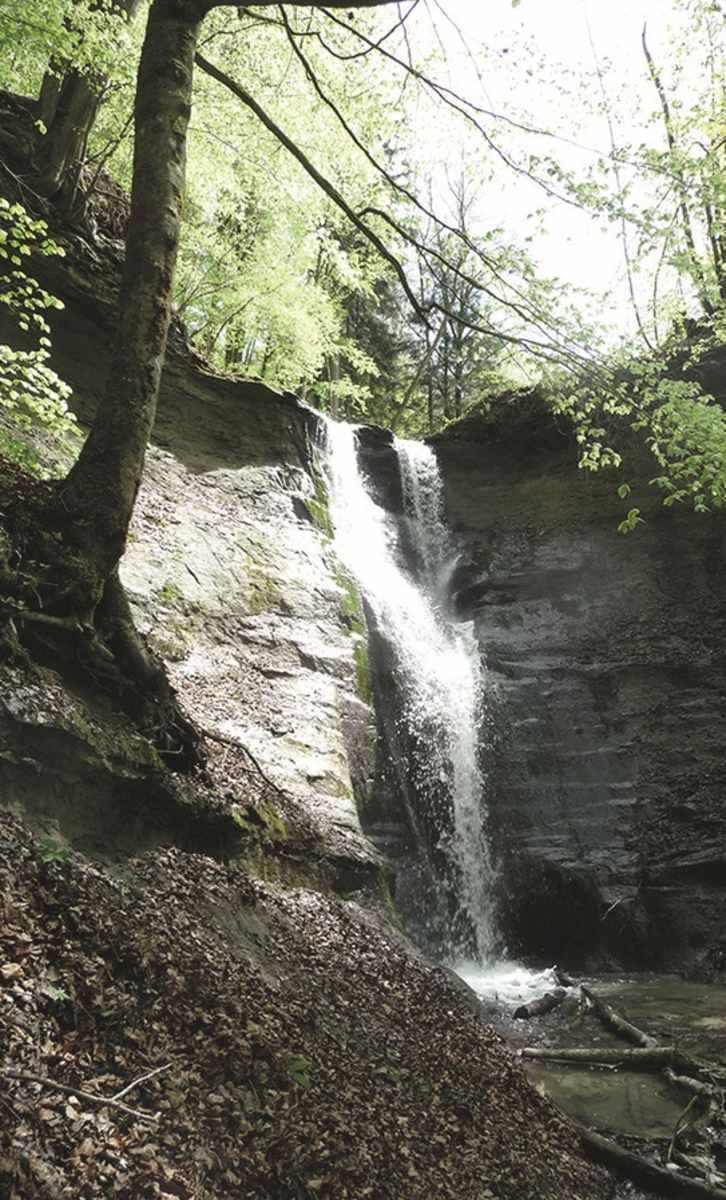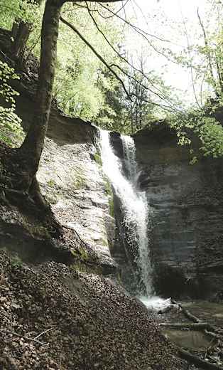 Vor allem im Frühling stürzen über eine Sandsteinwand große Wassermengen in einen Kessel, welcher über einen Treppenweg umgegangen wird. Nun gilt es über eine kurze Leiter aus Metall eine kleine Felswand zu erklimmen, wo später auch ein Weglein an der Oberkante des Kessels weiterführt. Man quert den Bach über eine Holzbrücke und folgt steil hinauf dem Weg nach Rüedisbach. Mit schönem Ausblick marschiert man entlang der Route von Hinter Leggiswil nach Riedern, von wo man weiter einem schmalen Pfad in der Sandsteinfluh hinunter nach Wynigen folgt.