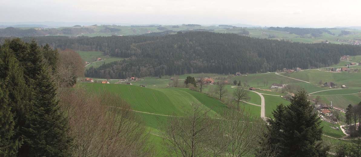 Dort steht ein 21,5 m hoher Aussichtsturm, der einem einen breiten Rundumblick zwischen Napf und Jura ermöglicht. Der Alpenzeiger auf der Panoramaübersicht nennt 150 Alpengipfel vom Säntis bis zu den Freiburger Bergen. Weiter steigt man leicht ab zum Schmidwald, nach dessen Durchquerung man rechts Richtung Kopf und Wyssbach (P. 663) abbiegt. Weiter absteigend über Titti, dann kurz steil über den Pfad hinunter, rechts auf der Ortstraße hinunter nach Rohrbach, wo man in der Nähe des Bahnhofs ankommt.