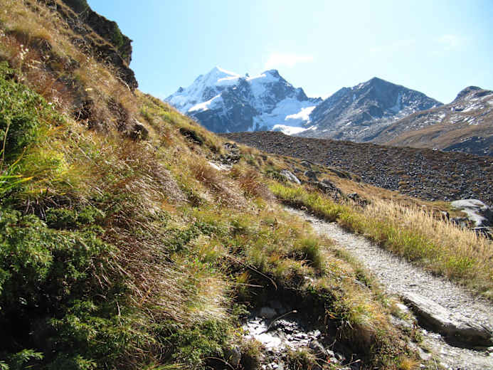 Aussichtsreiche 5. Etappe des Weitwanderweges "Bernina Treck" mitten in der Berninagruppe im Kanton Graubünden in der Schweiz: Diese Wanderetappe führt ausgehend von Chamanna Tschierva durch das wundervolle Val Roseg nach Pontresina, weiter über Morteratsch und Chünetta zum Chamanna Boval.