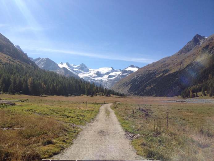 Man verlässt die Chamanna Tschierva (2.583 m) und steigt, dem markierten Weg folgend, durch das Val Roseg in Richtung Pontresina ab. Im oberen Teil des Tales hat man eine gute Chance, Gämse und Murmeltiere zu sehen. Der untere Teil führt am Fluss Ova da Roseg entlang durch einen Lärchen- und Arvenwald. Zu beachten ist, dass man nach dem Hotel Roseg Gletscher den markierten Wanderweg rechter Hand nimmt und nicht der breiten Fahrstrasse folgt.