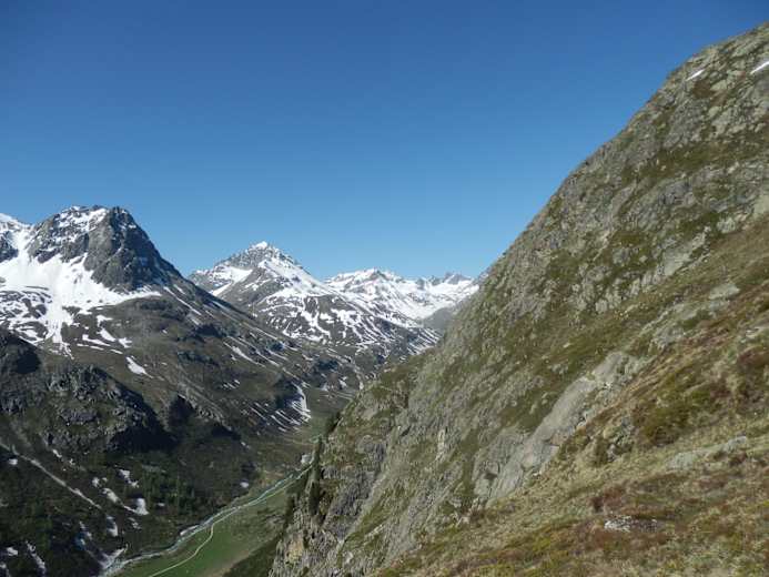 Weiter geht es entlang der meist wenig befahrenen Passstrasse zum Ospiz (2,5 h, Restaurant). Auf der rechten Talseite folgt man dem Weg rund 1,5 km, bis das Gelände steil zu den Seen abfällt. Hier steigt man nach links über die Fahrstrasse in Richtung Fuorcla Crap Alv auf.