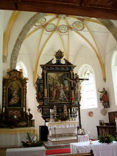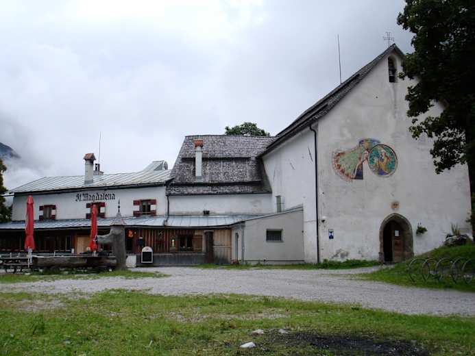 Man folgt der Straße weiter abwärts, sollte dann aber die Abzweigung nach rechts nach St. Magdalena nicht verpassen. Auf einem schönen kleinen Wiesenboden steht das Gasthaus, ehemals ein Kloster, mit Kirche, umgeben von alten Ahornbäumen.
