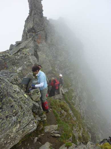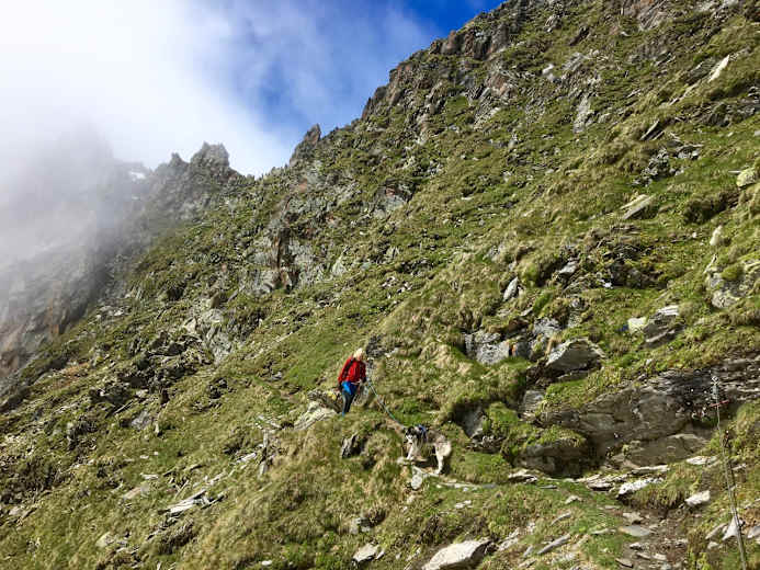 Das letzte Stück des Anstieges ist dabei recht steil und im Geröll sind maximal Trittspuren zu finden. Vorsicht ist zudem geboten, da das Geröll zum Teil Eisflächen der Gletscherausläufer bedeckt. Am besten folgt man immer den Markierungspfosten, die im Schartendurchgang montiert sind. Der Durchgang zwischen den Felszacken ist schmal und mit breitem Rucksack streift man schon mal links und rechts.