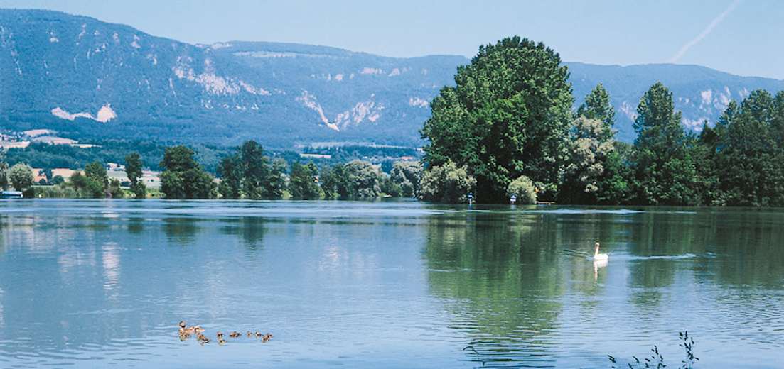 An dieser Stelle ist die Aare beeindruckend breit: 130 m liegen zwischen den beiden Ufern. Am Nordufer befindet sich die Storchenkolonie Altreu. Schon aus der Ferne sieht man auf Dächern und Bäumen die riesigen Nester und ihre geflügelten Bewohner.