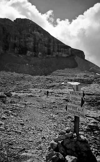 Nach einer wohl verdienten Stärkung auf der Pisciadù Hütte und einer Rast am gleichnamigen See geht es steil bergan auf das karge Hochplateau des Sella Stocks. Hier überschreitet man kaum merklich den höchsten Punkt der gesamten Tour mit 2.962 m.