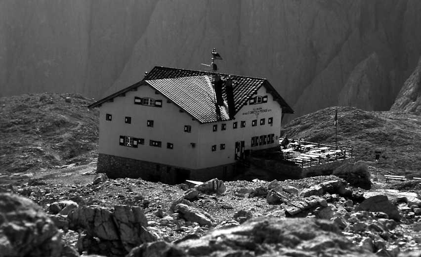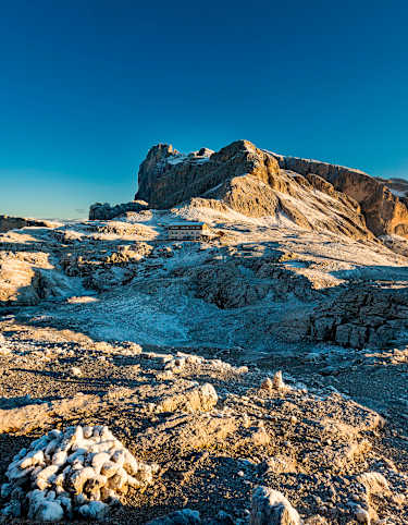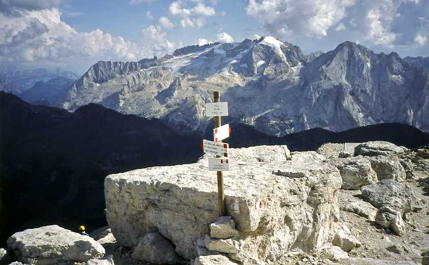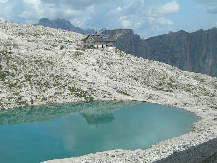 Ein sehr lohnender Abstecher ist die Boé Spitze mit 3.152 m, die man von der Hütte aus in gut einer Stunde erreicht. Die grandiose Sicht auf die Dolomiten, die Civetta und bis zur Marmolada stellt einen würdigen Abschluss dieser Etappe dar.
