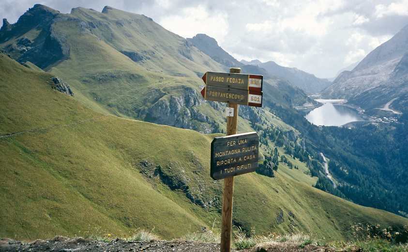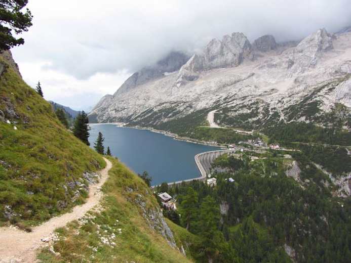 Der „Binnenweg“, auch „Brotweg“ genannt, führt entlang des Padonkamms, der sich zwischen Sella und Marmolada erstreckt. Vorbei am Rif. Fredarola und dem Rif. Viel del Pan auf 2.436 m genießt man die wunderbare Aussicht zur Marmolada und auf den Stausee.