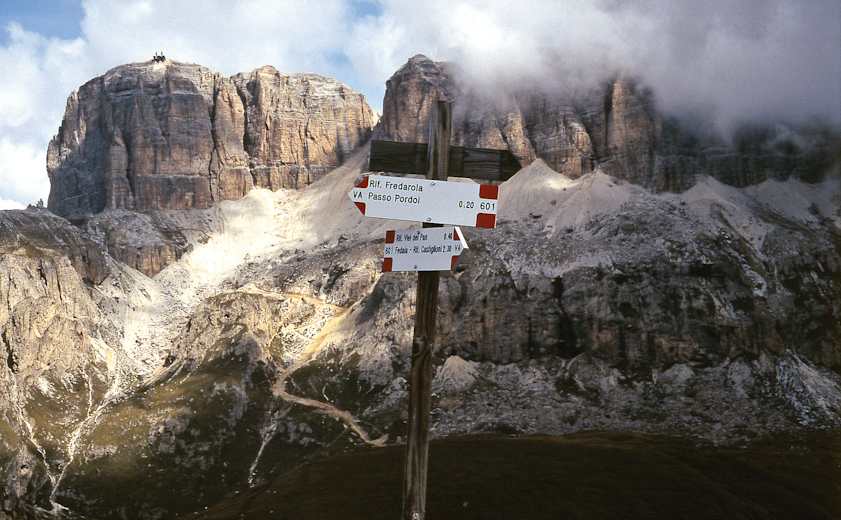 Von der Boè Hütte gelangt man Richtung Süden zur Pordoi Scharte (2.848 m), bevor man den steilen Abstieg zum Pordoijoch (2.239 m) in Angriff nehmen muss. Alternativ könnte man auch mit der Seilbahn zum Joch gelangen.