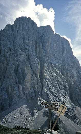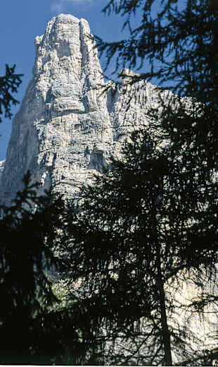 Ein Karrenweg führt zuerst gemütlich abwärts, bevor es dann Anfangs unter Lärchen, später zwischen den Latschen und schließlich über Geröll zum Fuße des beeindruckenden Castello delle Nevère bergan geht. Von der Palanzìn-Scharte (1.700 m) führt der mit rotem Schotter bedeckte Weg zwischen Latschen zur Forcella Col dell’Orso (Scharte auf 1.700 m) und weiter über Almen zur Camp–Scharte (1.933 m). Beeindruckt vom Torri del Camp geht es ein Stück abwärts und dann noch einmal hinauf zum Col dei Pass, wo das Rif. Bruto Carestiato (1.834 m) steht.