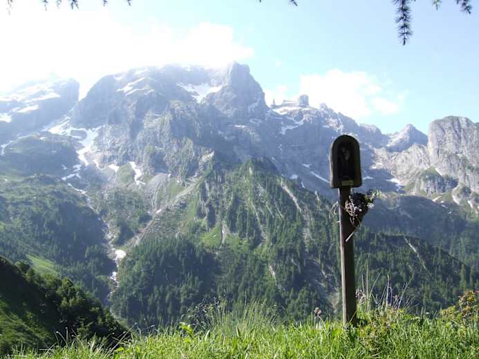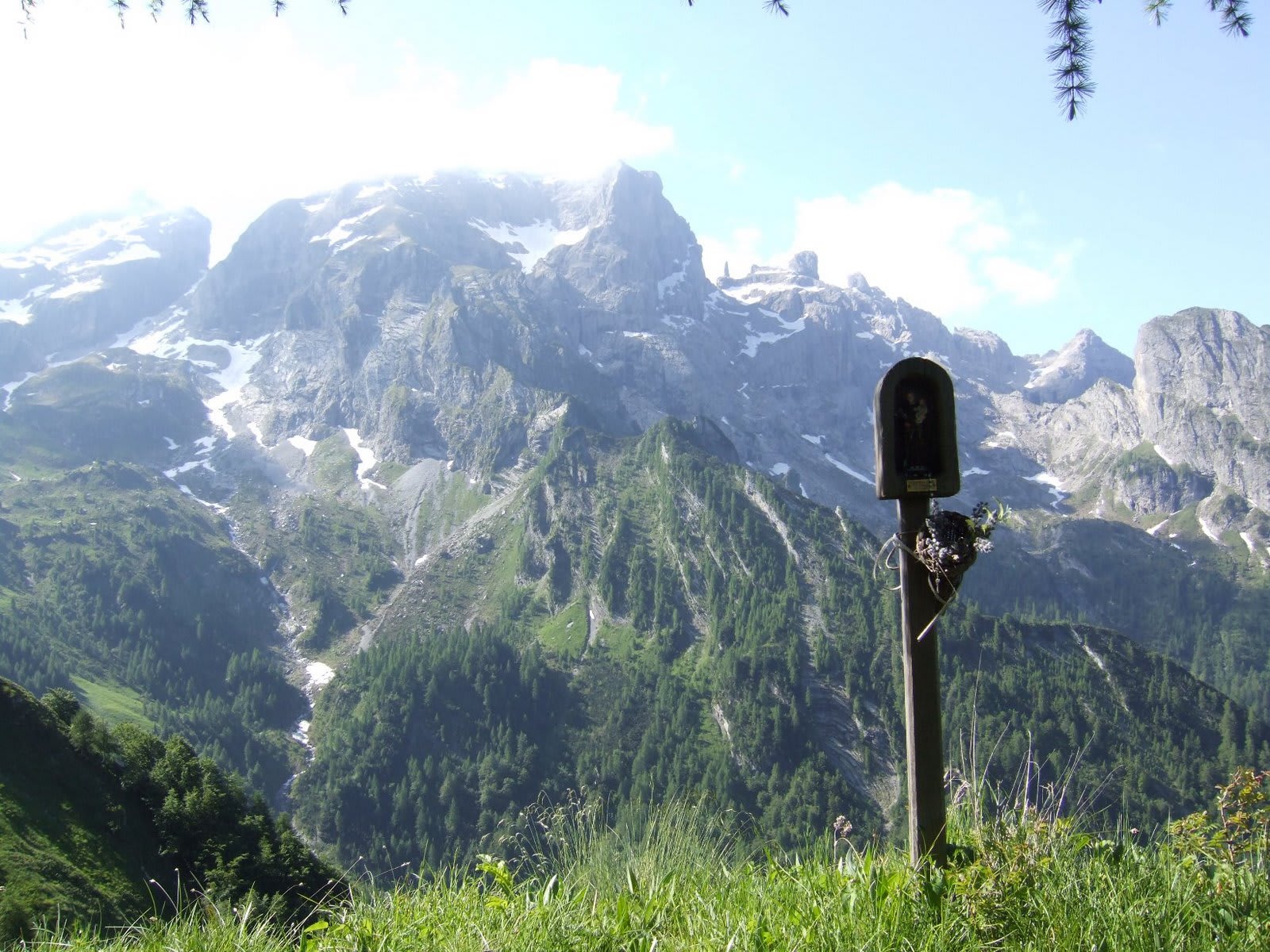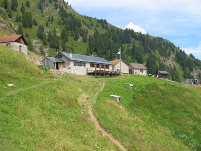 Vom Rifugio Pian de Fontana steigt man zunächst ein Stück ab, bis auf 1.490 m, wo sich die Abzweigung rechts hinauf zur Forc. La Valetta befindet. An einem Marterl vorbei gelangt man zur Weggabelung auf 1.660 m, wo man sich wieder rechts hinunter zum Rif. Bianchet ins Agordo Tal hält.