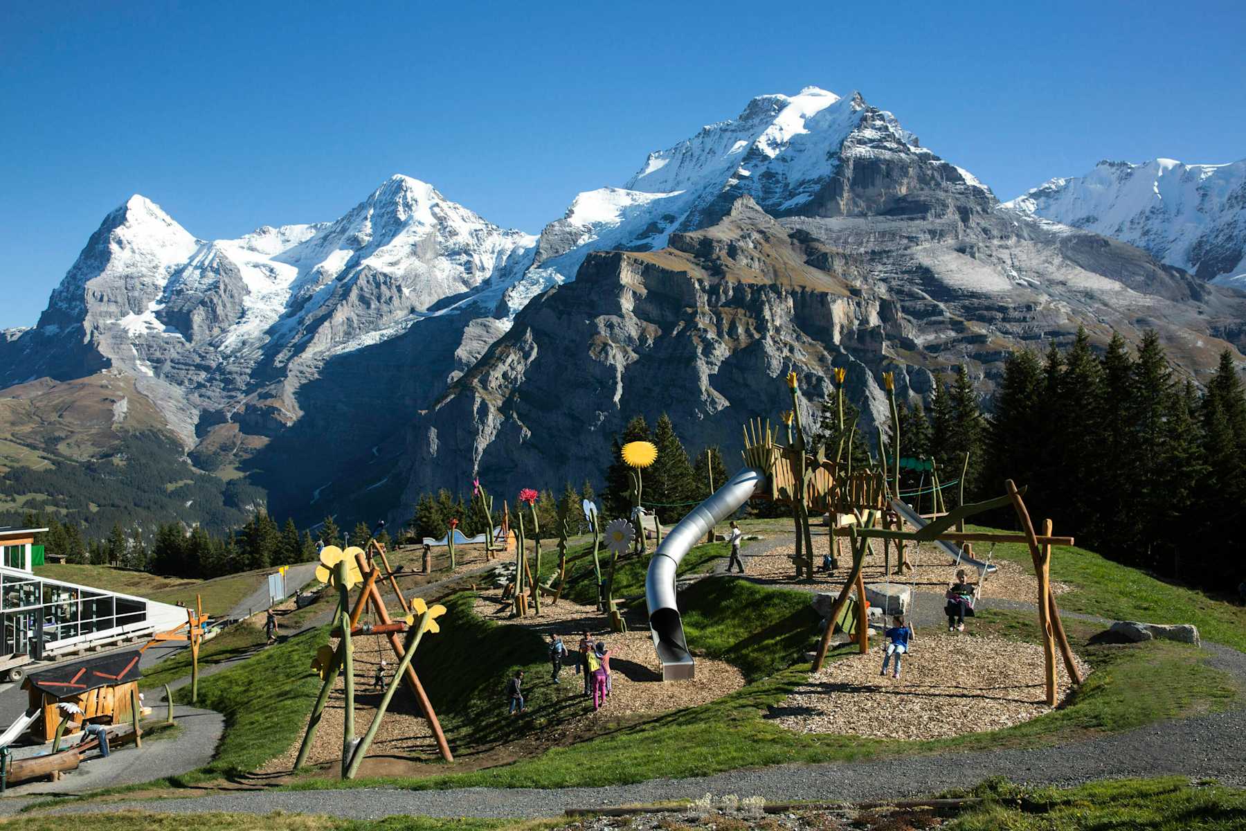 Der Children's Adventure Trail bei Mürren im Berner Oberland ist bequem mit der Stand- oder Luftseilbahn erreichbar und bietet traumhafte Lage und fantastische Aussicht auf die imposanten Gipfel der Berner Alpen.