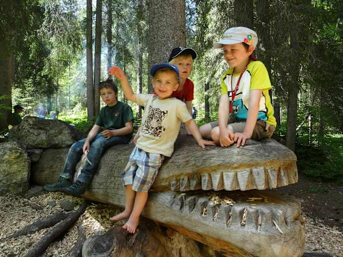 Toll geschnitzte Holzwegweiser markieren den Themenpfad und zahlreiche Spielstationen laden die Kinder zum Erlebnis inmitten der tollen Natur der Berner Voralpen ein.
