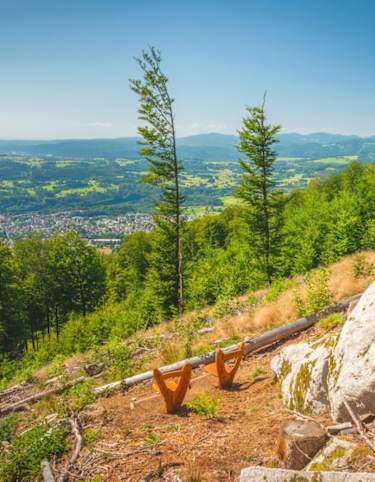 Auf dieser Etappe von von Frick nach Sennhütten führt der Weg durch Gehölz, durch kühle Wälder und über den aussichtsreichen Schinberg-Grat (722 m) vorbei an historischen Grenzsteinen.