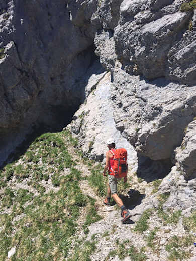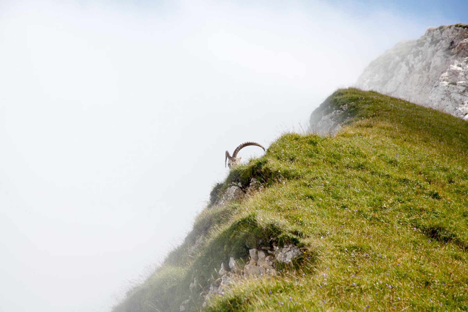 Anschließend folgt man dem Bergweg über die Nordseite des Widderfelds zum Gemsmättli. Neben den Bergen in der Ferne lohnt es sich, auch die nähere Umgebung im Blick zu behalten. Mit etwas Glück lassen sich so Steinböcke beobachten, die sich gerne auf der Nordseite des Grats aufhalten.