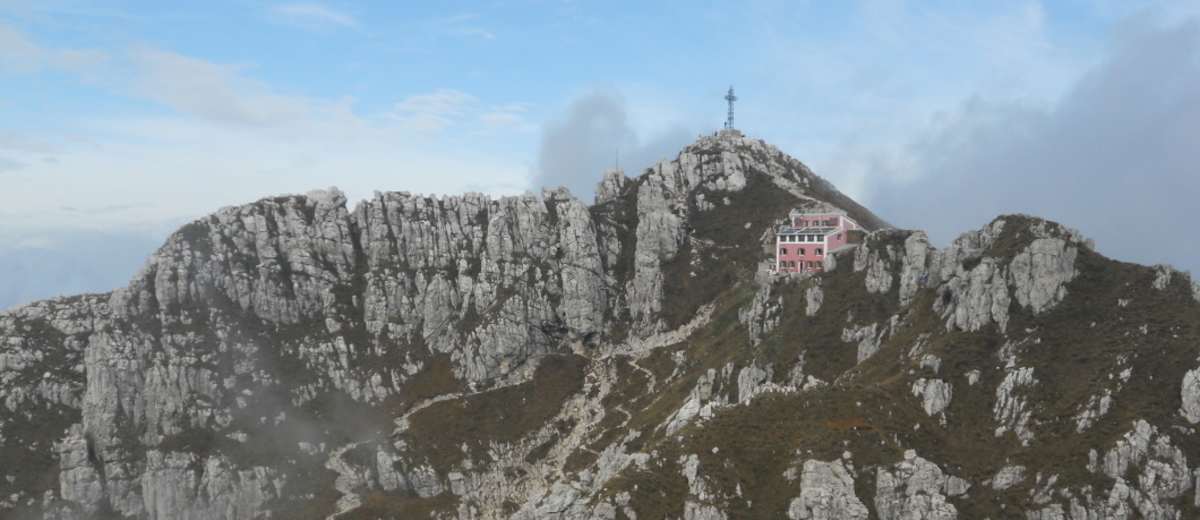 Weiter verläuft der Weg links zum Colletto di Brumano (1.500 m). Ab hier führt der Weg in Serpentinen über die steilen Hänge bis zum Schutzhaus. Unweit der Hütte befindet sich das große Gipfelkreuz des Monte Resegone auf 1.870 m.